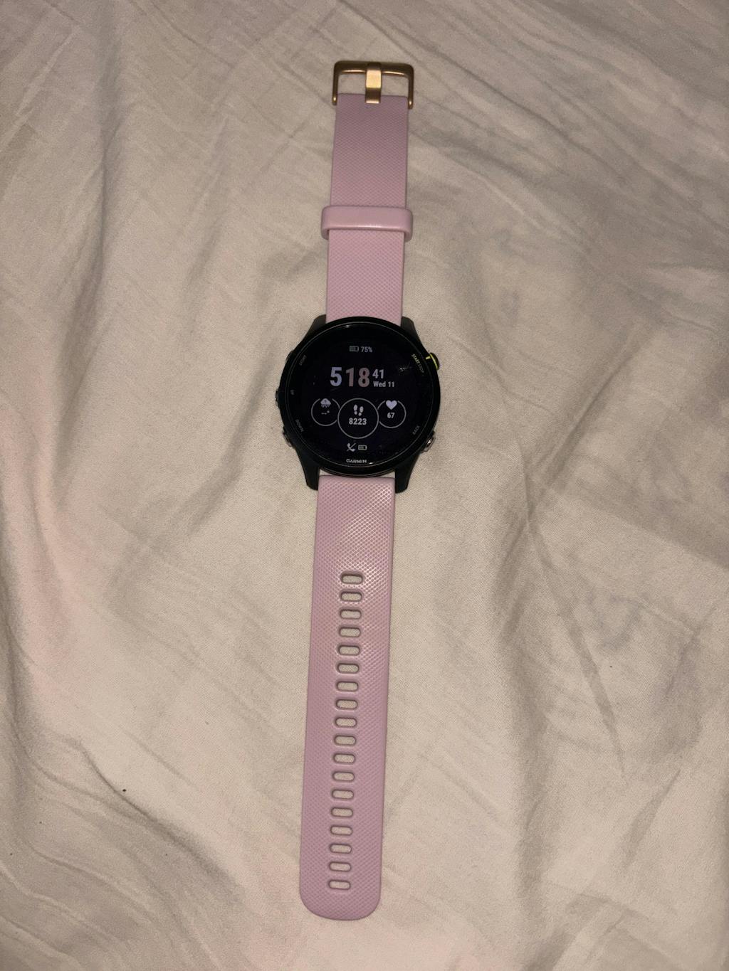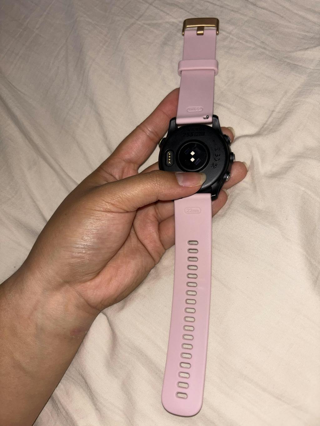 I bought a 22mm quick fit pink silicone strap with rose gold buckles and it fits perfect with my Garmin Forerunner 255 Music. Easy to get on and off and to clean. Hasn’t become sun bleached or discoloured (note- it has only been 3 months). The only problem is a small spot on my wrist became irritated, however, I think that’s an issue with taking it off during showers and after water contact so that your skin and the strap gets cleaned and dried properly. Other than that- great watch strap.